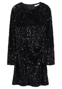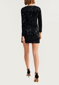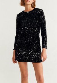 Femme portant une mini-robe noire à manches longues ornée de sequins, avec un col rond, sur un fond clair uni.