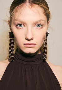 Jeune femme aux cheveux blonds portant une robe sans manches marron foncé et de longues boucles d'oreilles noires perlées, debout contre un mur clair uni.