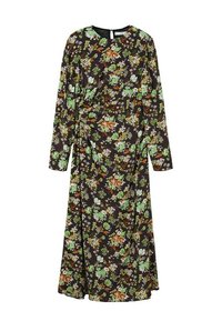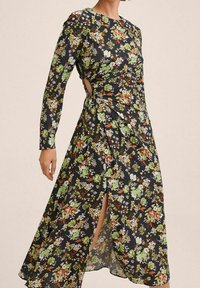 Robe midi noire à manches longues, taille élastique, avec un petit motif floral rose, jaune et vert sur toute la surface.