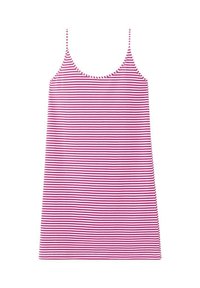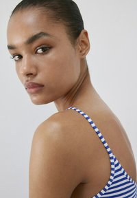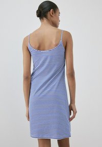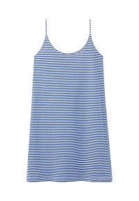 Femme portant une robe sans manches rayée bleu et blanc, debout contre un mur clair uni, touchant son épaule.