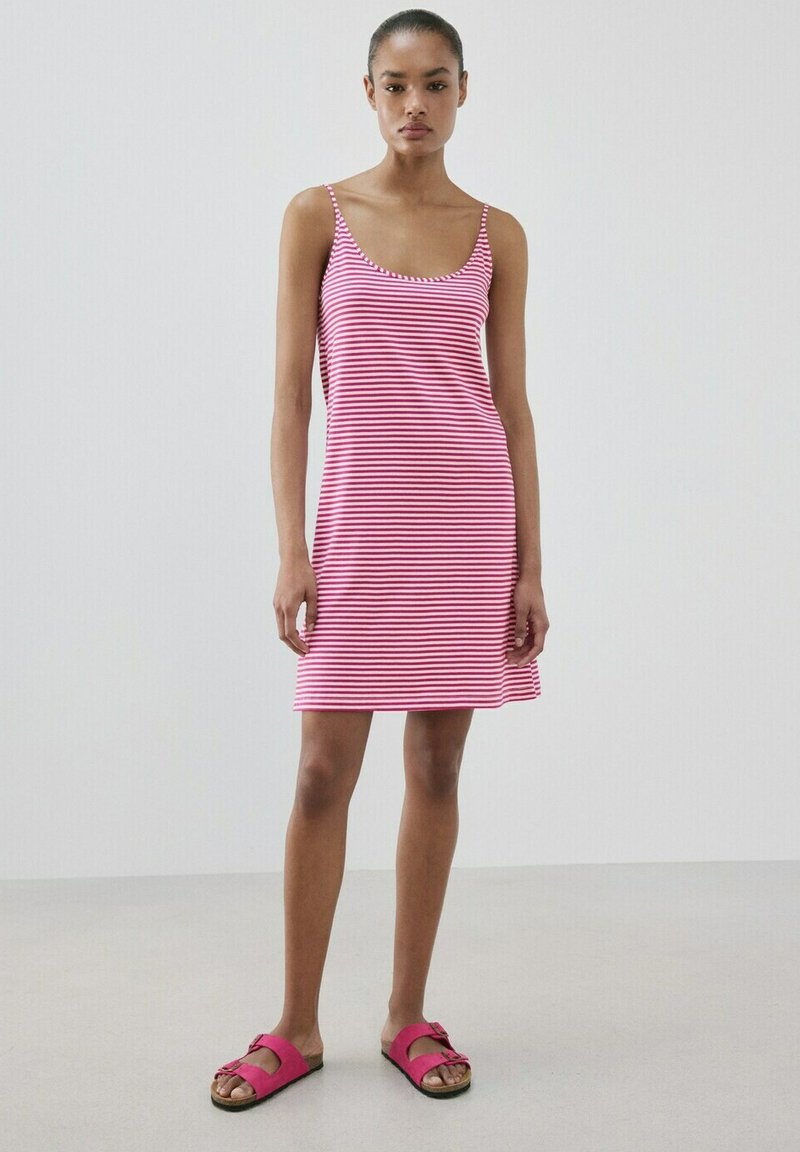 Femme debout portant une robe sans manches rayée rose et blanche et des sandales slides roses sur un fond gris clair uni.