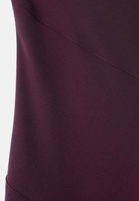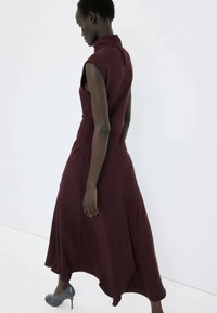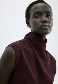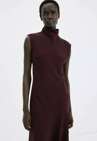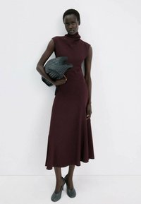 Femme portant une robe midi bordeaux foncé sans manches et des escarpins gris, tenant une grande pochette noire texturée contre un mur blanc.