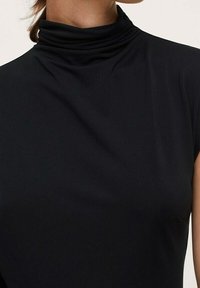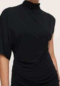 Robe mini noire avec un col montant froncé et une manche courte asymétrique. Tissu doux et extensible avec un design drapé.