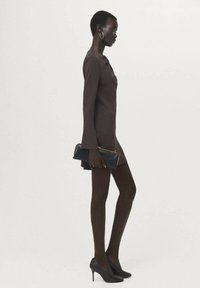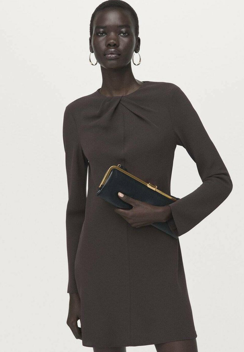 Robe marron ajustée à manches longues et col froncé, associée à une pochette noire avec ferrures dorées.