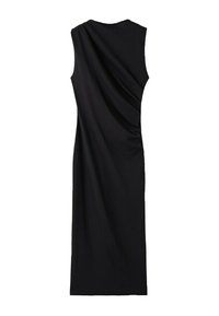 Robe sans manches bleu marine avec une silhouette ajustée, détail froncé à l'épaule, longueur mi-mollet et texture lisse. Accentuée par des sandales dorées.