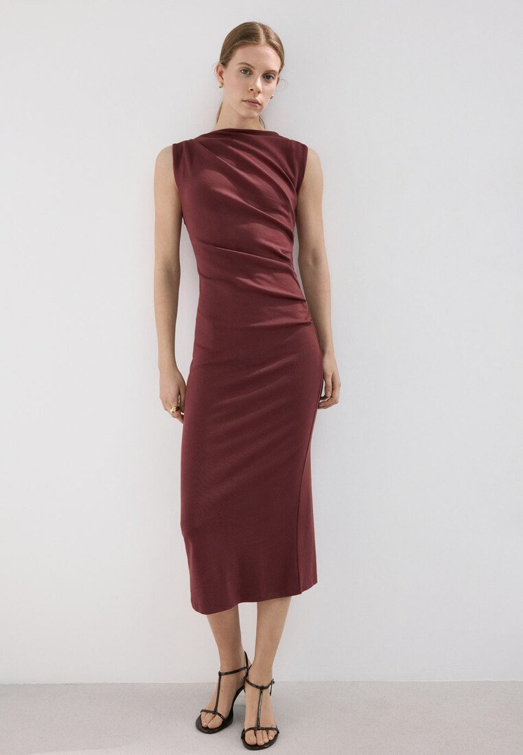 Femme portant une robe bordeaux sans manches, longueur genou avec un détail drapé, debout contre un mur blanc, portant des talons noirs à brides.