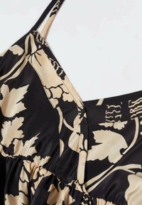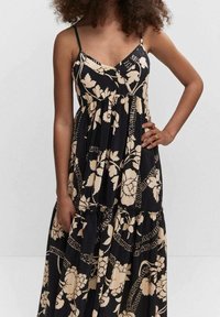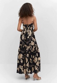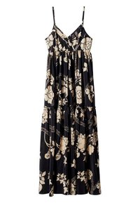 Robe longue en tissu noir avec un motif floral crème, bretelles spaghetti et taille froncée, s'évasant en une jupe ample.