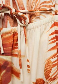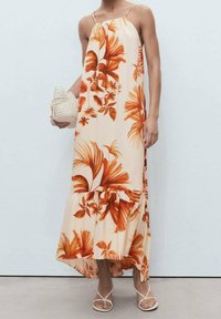 Femme portant une robe longue beige sans manches avec un motif de feuilles tropicales orange, des sandales blanches à brides, et des bracelets noirs et beiges en marchant.