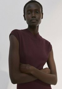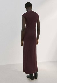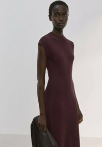 Femme portant une robe longue sans manches bordeaux, bottines noires, tenant une grande pochette noire à franges dans une pièce blanche et vide.