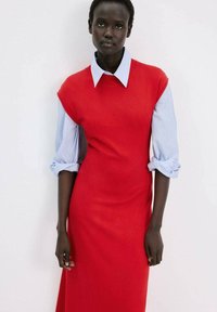 Femme portant une robe maxi rouge sans manches sur une chemise bleu clair aux manches retroussées et des sandales à talons noires, debout devant un fond uni.