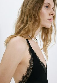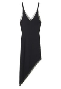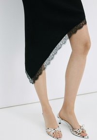 Femme aux longs cheveux portant une robe asymétrique noire avec des bordures en dentelle et des sandales à talons blanches, debout devant un fond blanc uni.