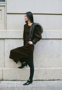 Femme aux longs cheveux noirs portant une robe midi marron à épaules dénudées, un pantalon noir et des chaussures à talons noires, se tenant contre un mur en pierre.