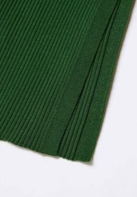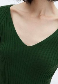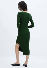 Robe en maille côtelée verte avec un col en V et des manches longues, présentant un ourlet asymétrique. Assortie à des chaussures plates noires.