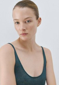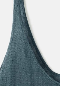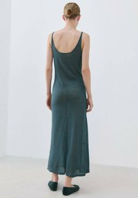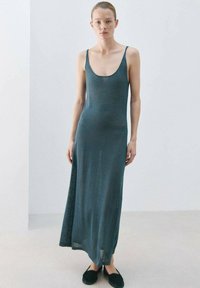 Femme debout portant une robe sans manches à encolure dégagée, longue jusqu'aux chevilles, de couleur bleu sarcelle foncé, et des chaussures plates foncées, sur un fond clair uni.