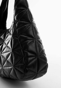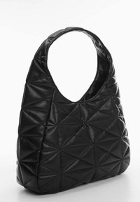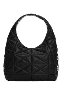 Sac à main noir matelassé avec une forme de hobo surdimensionnée, fabriqué en matériau synthétique lisse, présentant un motif de triangles en relief.