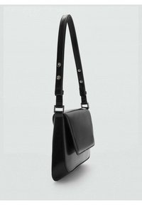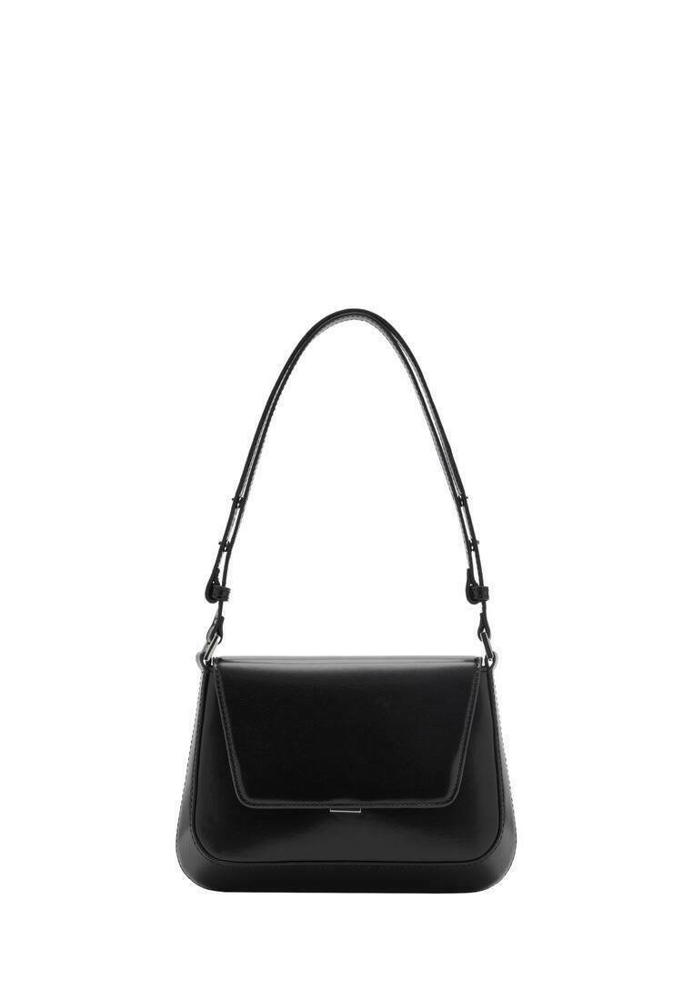 Sac à main en cuir noir au design structuré, avec une bandoulière réglable unique et une fermeture à rabat. Texture lisse et quincaillerie minimale.