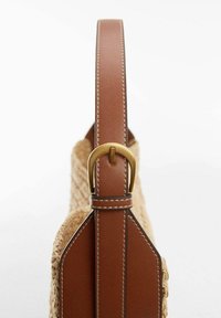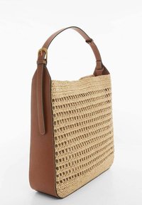 Sac d'épaule en paille tissée de forme rectangulaire, présentant un tissage ouvert texturé, une bandoulière en cuir marron et sans éléments métalliques visibles.