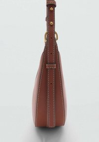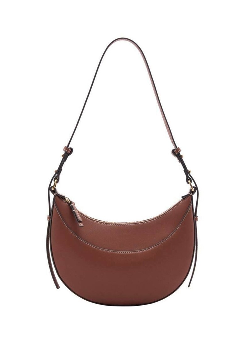 Sac d'épaule en cuir marron à la forme courbée, bandoulière réglable et coutures contrastées ; possède une fermeture éclair et un design minimaliste.