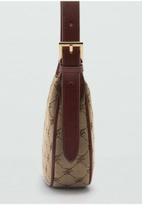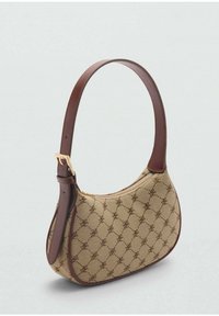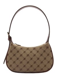 Sac à main en tissu beige avec un motif de logo marron distinctif, une forme incurvée et une courte bandoulière en cuir lisse. Doté d'une fermeture éclair.