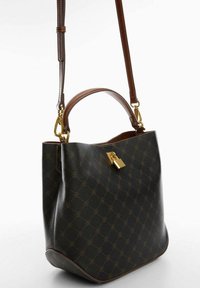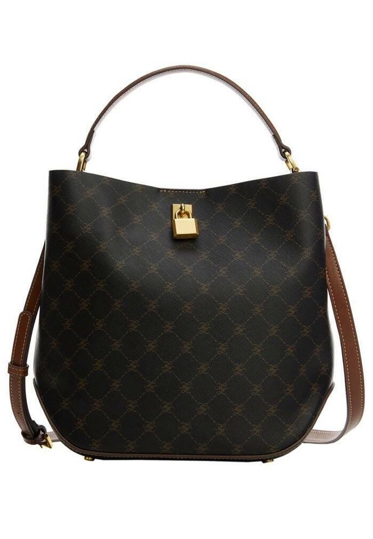 Sac cabas marron à motif avec une forme légèrement structurée, doté d'un détail de cadenas doré, de deux poignées et d'une bandoulière réglable.