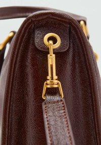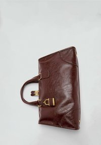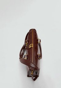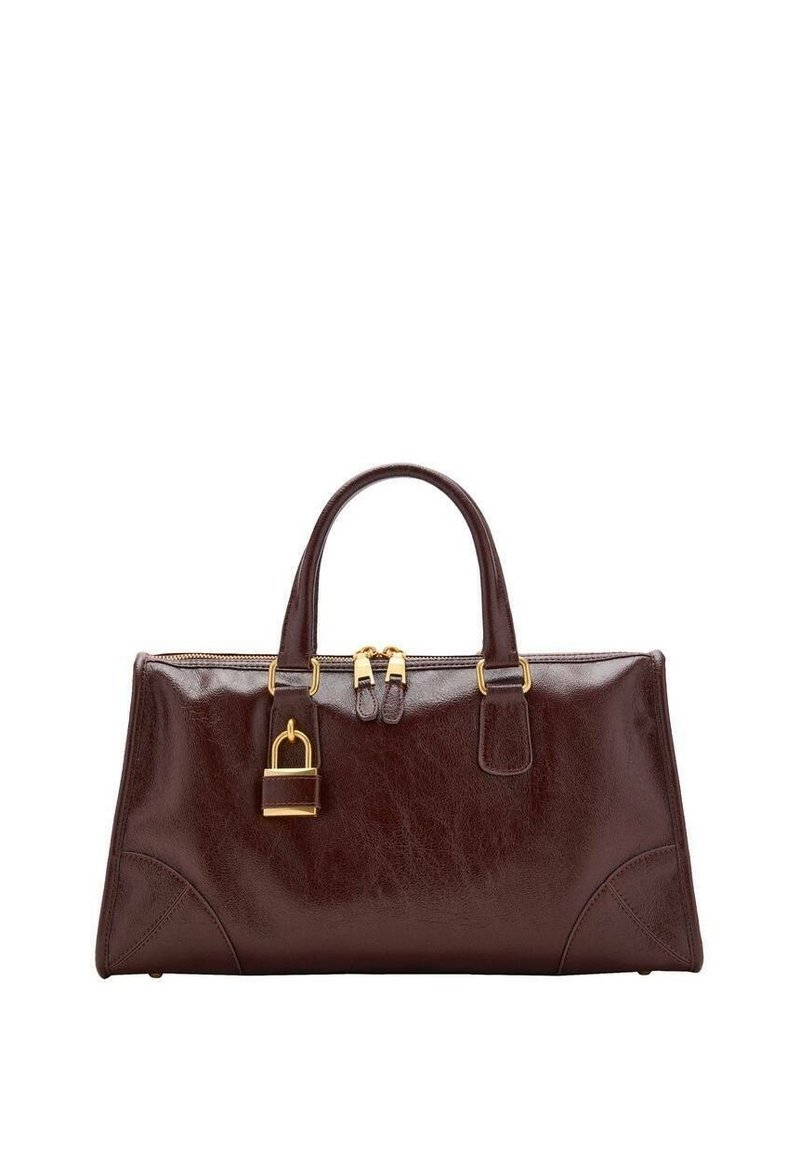 Sac à main en cuir marron foncé avec doubles anses, fermeture éclair dorée et détail de cadenas à l'avant, forme rectangulaire avec base structurée.