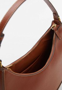 Sac d'épaule en cuir marron avec dessus incurvé, sangle réglable, fermeture éclair dorée et bordure noire sur fond blanc.
