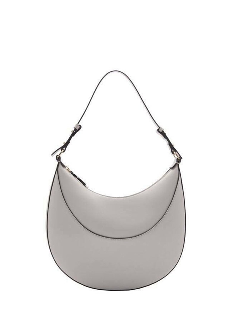 Sac bandoulière en cuir gris à design courbé, garniture noire contrastante et bandoulière réglable. Texture lisse et style minimaliste.