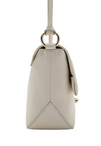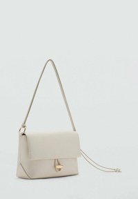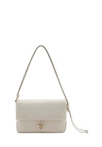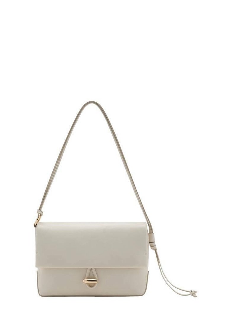 Sac à bandoulière en cuir beige avec fermeture à rabat et fermoir en métal doré, doté d'une sangle réglable avec un nœud à son extrémité.