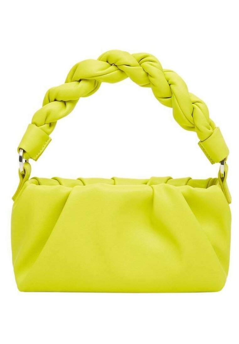 Sac à main jaune vif avec corps doux et plissé et anse épaisse tressée attachée par des anneaux métalliques de chaque côté.