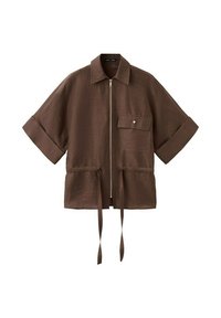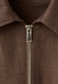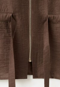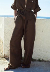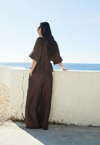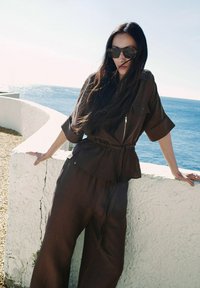 Femme portant une tenue ample marron foncé et des lunettes de soleil, appuyée sur un rebord en béton blanc au bord de l'océan par une journée ensoleillée.
