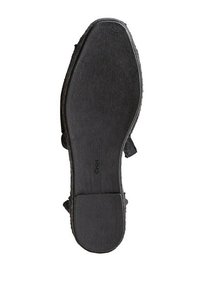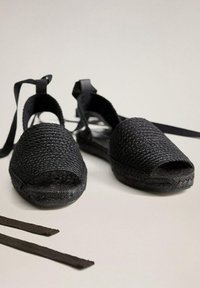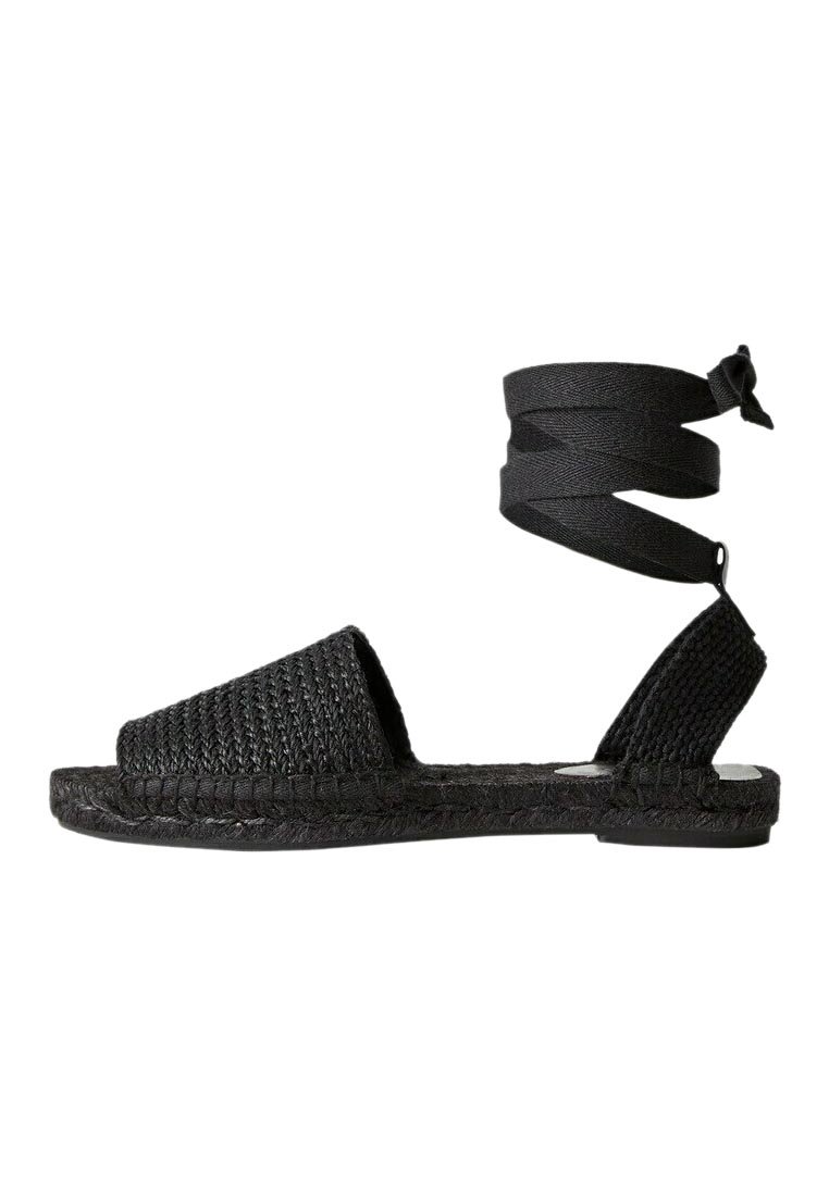 Sandales noires tressées avec une lanière de cheville. Dessus texturé et semelle plate en jute. Design simple sans matériel visible.