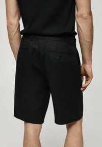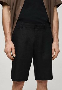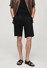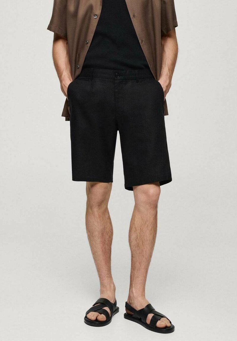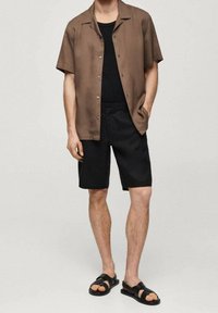 Homme portant un short noir, un t-shirt noir, une chemise brune à manches courtes et des sandales noires, se tenant les mains dans les poches.