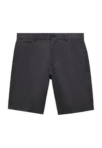 Shorts en denim gris avec des ourlets retroussés, associés à un t-shirt gris et des sandales noires. L'individu tient une veste grise.