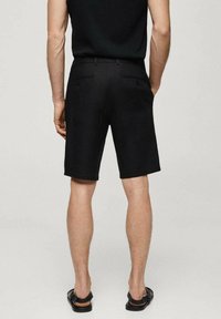 Homme portant un pantalon crème à fines rayures verticales, une chemise noire à manches courtes avec boutons et des sandales en cuir noir, debout devant un fond uni.