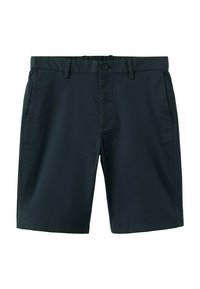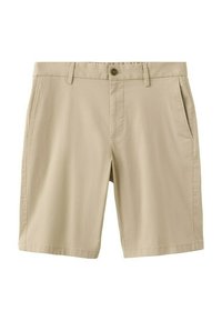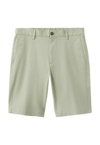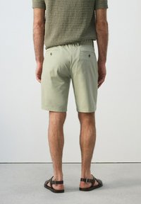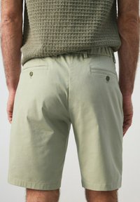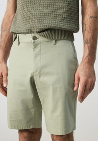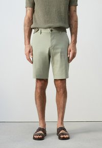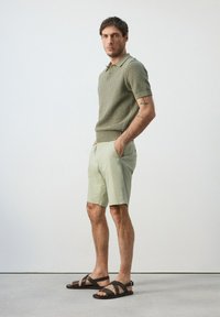 Homme portant un short vert clair mi-cuisses, un pull à manches courtes olive texturé, et des sandales marron foncé, debout devant un fond uni.