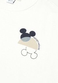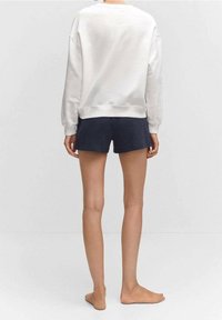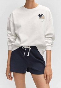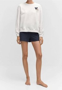 Personne portant un sweat-shirt blanc avec un petit motif de Mickey Mouse et un short à cordon de serrage bleu marine, debout les bras relâchés.