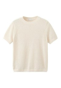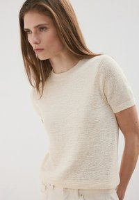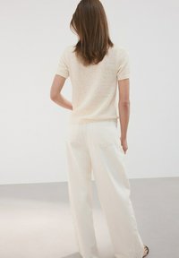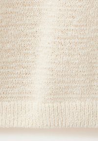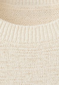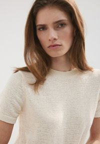 Jeune femme aux longs cheveux bruns portant un pull en maille crème à manches courtes et un pantalon de couleur claire, regardant légèrement sur le côté.
