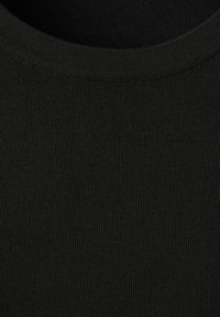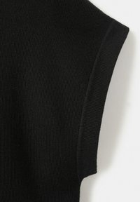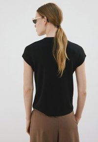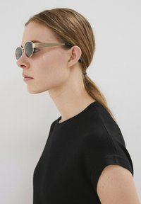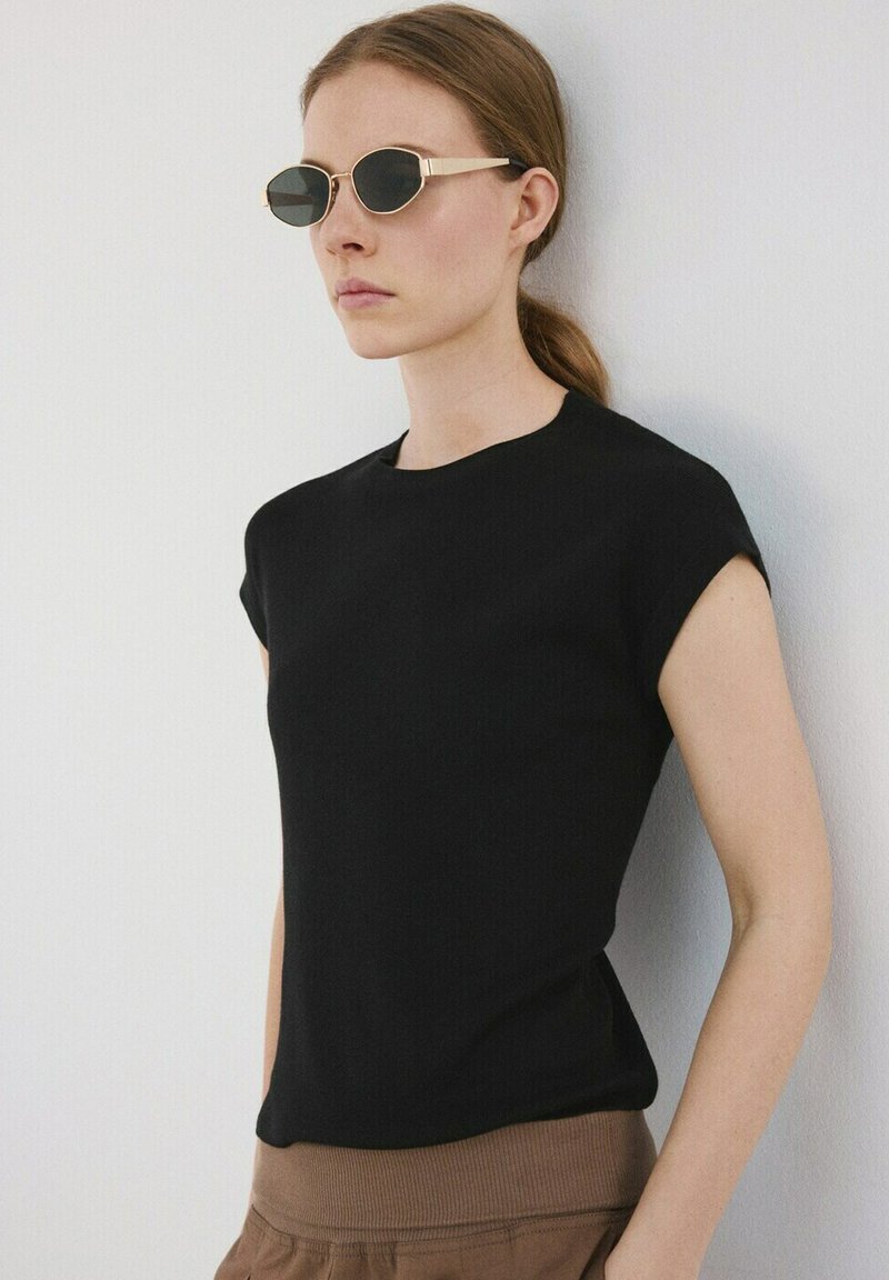 Femme aux cheveux châtain clair attachés en queue de cheval, portant des lunettes de soleil ovales noires, un haut noir sans manches et un pantalon marron, debout contre un mur blanc.