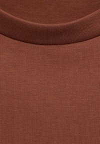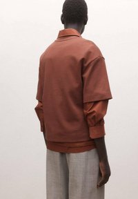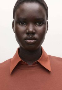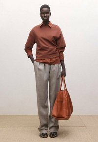 Femme portant des hauts superposés de couleur rouille et un pantalon gris, tenant un grand sac à main en cuir rouille avec double poignée.