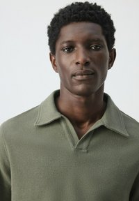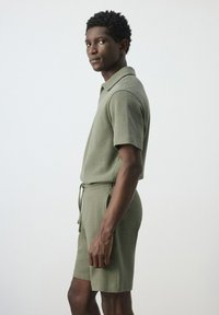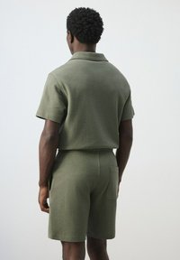 Un homme se tient les mains dans les poches, portant un polo en maille vert olive à manches courtes et un short en maille assorti, sur un fond clair uni.