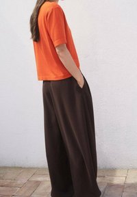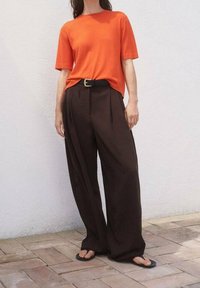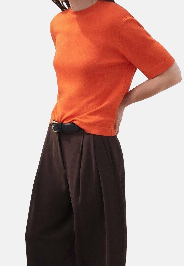Haut orange à manches courtes avec un col rond, porté avec un pantalon marron foncé plissé à taille haute et une ceinture noire, affichant une coupe décontractée.