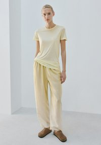 Femme aux cheveux blonds portant un t-shirt à manches courtes jaune pâle et un pantalon ample assorti, sur un fond clair uni.