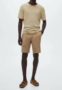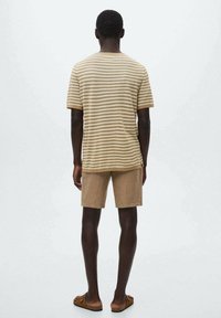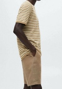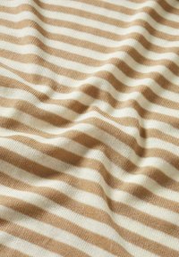 T-shirt rayé beige et crème avec un col rond, associé à un short marron clair. Texture douce et coupe décontractée. Aucun motif ni élément métallique visible.