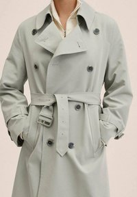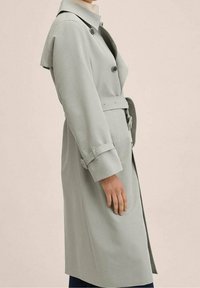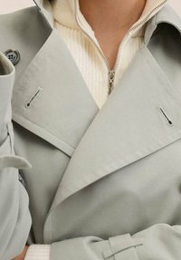 Trench-coat gris clair à double boutonnage, porté sur un pull rayé et un jean flare en denim foncé. Petit sac à main noir, chaussures noires.