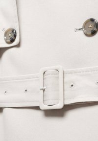 Femme portant un trench-coat beige ceinturé avec des boutons croisés et des détails à boucles sur les manches et les épaules.