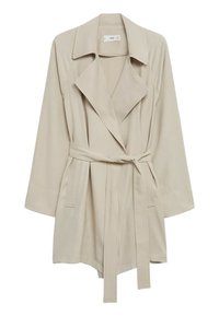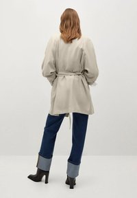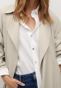 Femme nouant la ceinture d'un trench beige porté sur une chemise blanche et un jean bleu, coupé au niveau du cou et mi-cuisse.