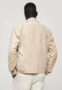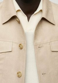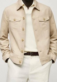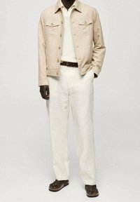 Homme portant une veste beige boutonnée par-dessus un pull tricoté blanc, un pantalon blanc et une ceinture sombre tressée, les mains dans les poches.
