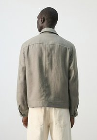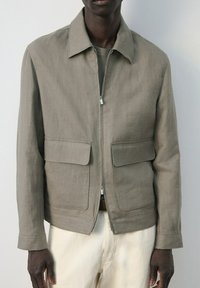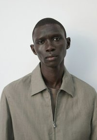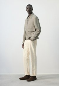 Homme portant une veste beige, une chemise marron, un pantalon crème et une ceinture marron, debout devant un fond clair uni.