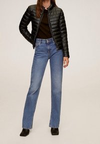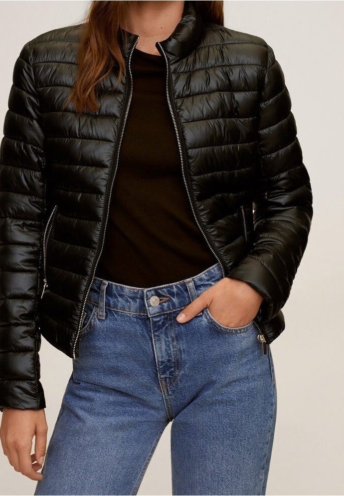 Femme portant une veste matelassée noire à fermeture éclair par-dessus un haut noir avec un jean bleu taille haute, une main dans la poche, sur un fond neutre.