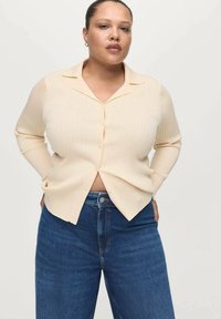 Femme portant une chemise crème côtelée boutonnée, un jean large bleu et des bottes noires à talons pointues, debout avec une main sur la hanche.